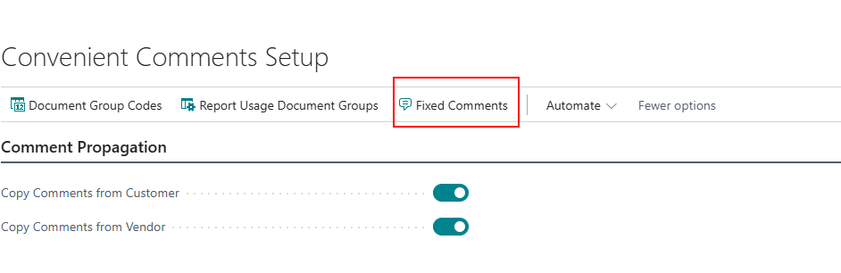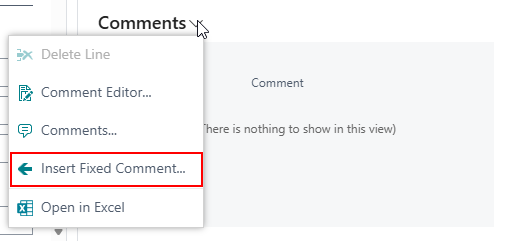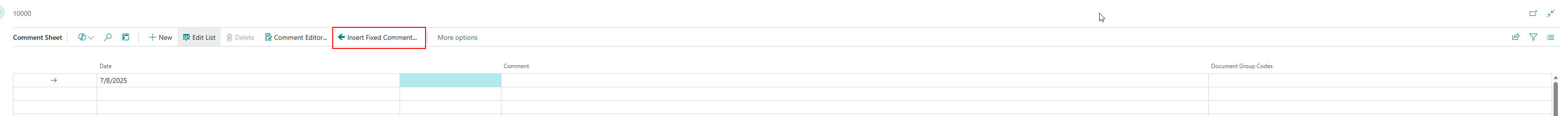 In the Comment factboxes and Comment Sheet pages across Business Central, an Insert Fixed Comment action is available to quickly add the comment lines of fixed comments to the related record: