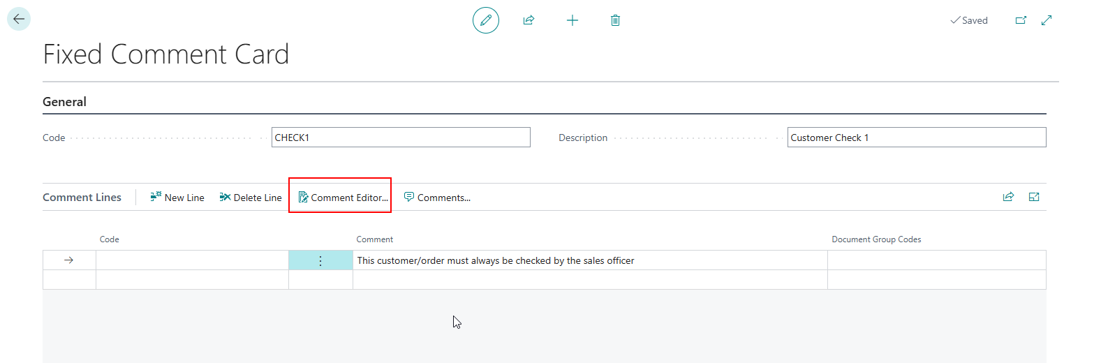 Open the Convenient Comments Setup page and invoke the Fixed Comments action to open the Fixed Comments page which allows you to set up and/or edit fixed comment sets.